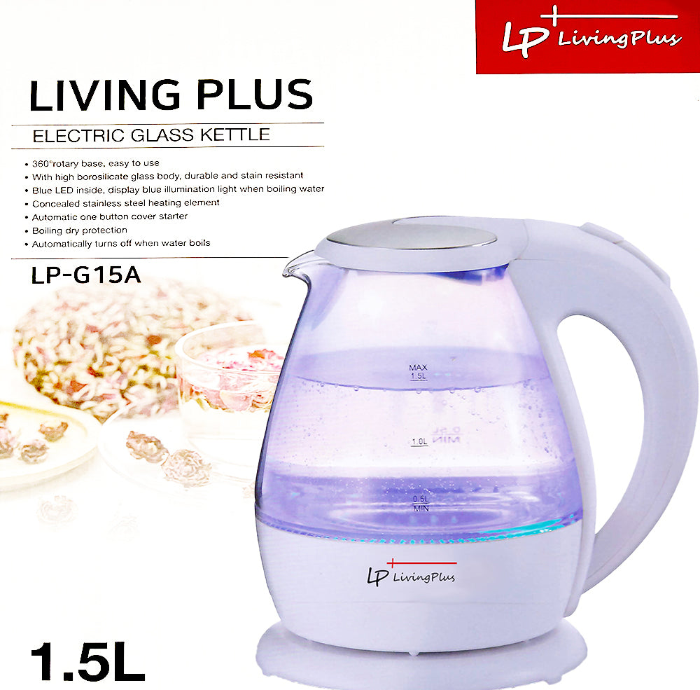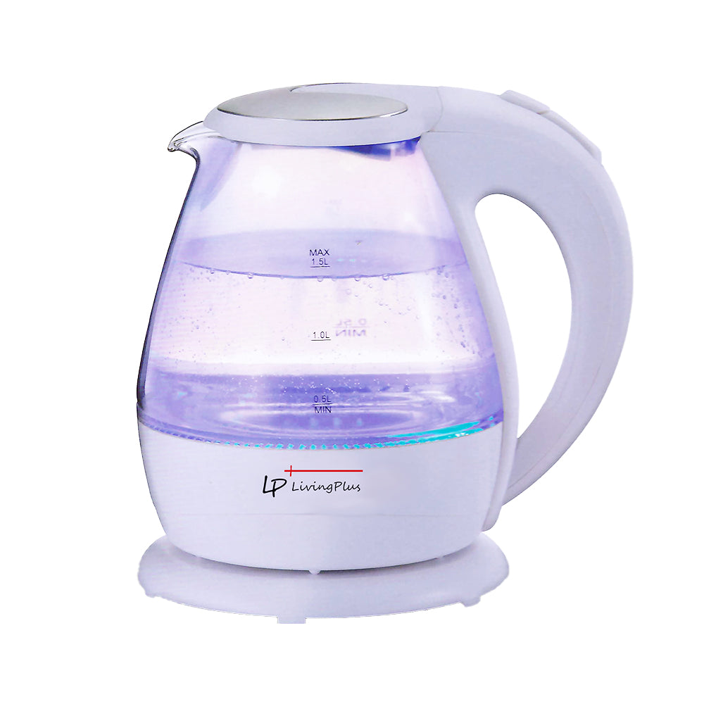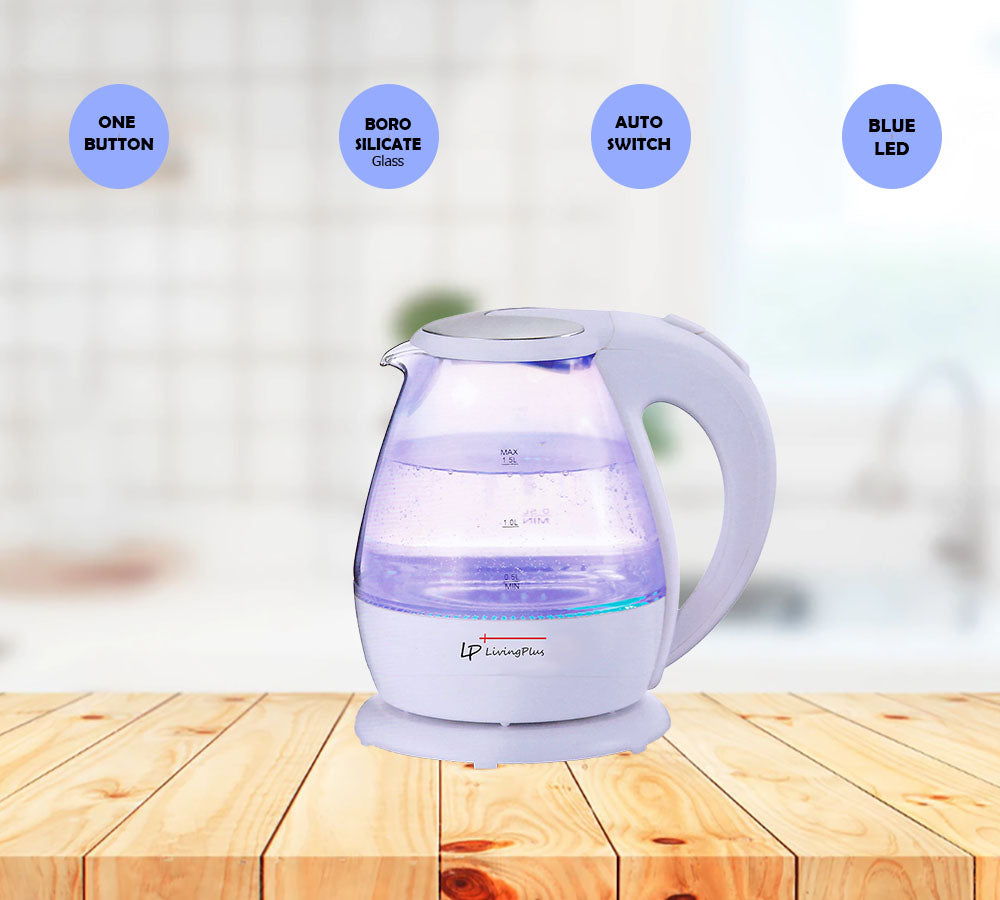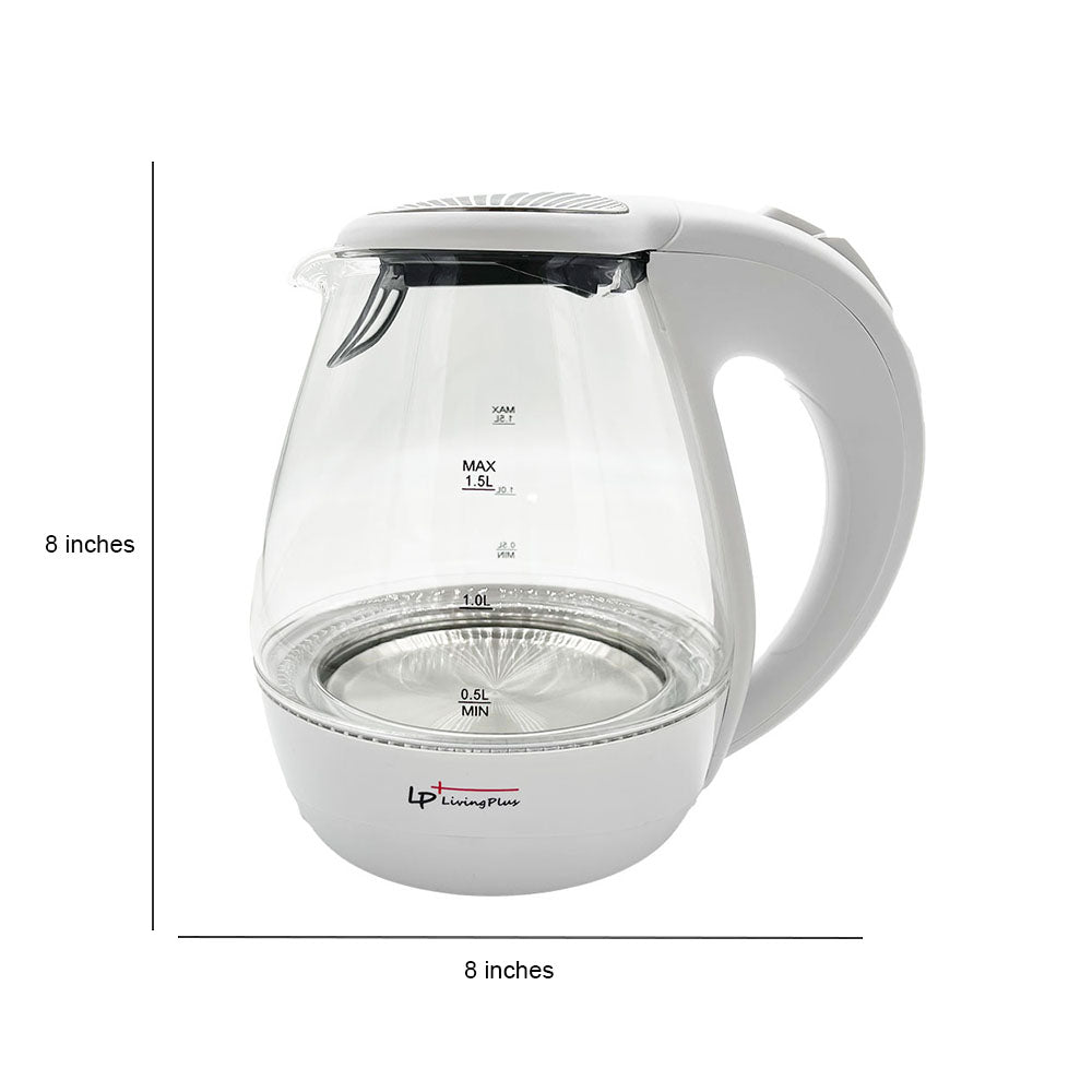 LP Living Plus 1.5L Borosilicate Glass Electric Tea Kettle, Fast Hot Water Boiler, Cordless, One Touch, Automatic switch