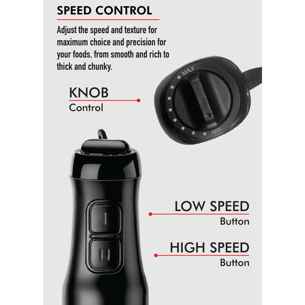 Includes: Stainless steel Blending shaft, 20fl oz Beaker, Whisk, and 500ml chopper