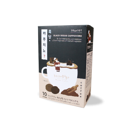 Black Sugar Cappuccino includes 10 Tea Sticks - 20G Each. Great taste of bitter sweetness in each sip. Ingredients: Sugar, Hydrogenated vegetable oil(soy lecithin), Maltodextrin, Black sugar, Whey powder, Skim milk, Instant coffee, Artificial Black sugar flavor, Calcium triphosphate, Carboxymethyl cellulose, Salt. CONTAINS MILK AND SOYBEANS.